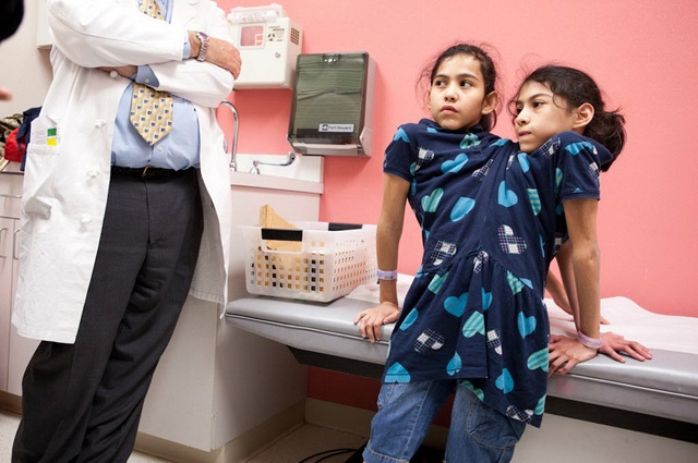 摄影记者Annabel Clark三年前在美国康涅狄格州,见到一对来自墨西哥的11岁连体姐妹Carmen和Lupita。这对连体姐妹各自控制两只胳膊和一条腿,共享生殖器官和消化系统。